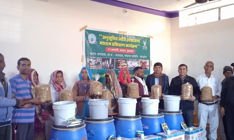 उदयपुर। अखिल भारती समन्वित मशरूम परियोजना, राजस्थान कृषि महाविद्यालय, उदयपुर के तत्वधान में अनुसूचित जनजाति उपयोजना (टी.एस.पी) के अंतरगत ग्राम पंचायत मकड़ादेव में एकदिवसीय मशरूम प्रशिक्षण का आयोजन किया गया | मशरूम प्रशिक्षण में गांव पानरवा, मानस, मकड़ादेव, सेलाणा एवम आसपास के गांव के किसानों एवं महिलाओ ने भाग लिया | प्रशिक्षण में परियोजना प्रभारी डॉ. एन. एल. मीना ने बच्चों, महिलाओं में मशरूम के उपयोग से कुपोषण को दूर भगाने तथा अधिक आय प्राप्त करने हेतु मशरूम तकनिकी को अपनाने का विस्तार से व्याख्यान दिया तथा पंचायत समिति झाड़ोल के सहायक विकास अधिकारी श्रीमती शांता भुदरा ने महिलाओ को स्वयं सहायता समूह के माध्यम से मशरूम की खेती को बढ़ावा देकर अच्छी आय करने के लिए जोर दिया तथा क्षेत्र के कृषि पर्यवेक्षक श्री कमलेश चरपोटा ने प्र|कृतिक खेती व राजस्थान सरकार की अनुसूचित जनजाति किसानों के लिए विभिन्न कल्याणकारी योजनाओं के बारे में बताया गया तथा श्री अविनाश कुमार नागदा, किशन सिंह राजपूत एवम रवींद्र चौधरी ने प्रशिक्षण में भाग लेने वाले प्रशिक्षणर्थीयो को मशरूम की प्रयोगिक जानकारी दी तथा प्रशिक्षण के अंत में अनुसूचित जनजाति उपयोजना के कुल 25 प्रशिक्षणर्थीयो को सामग्री वितरित की गई |