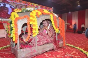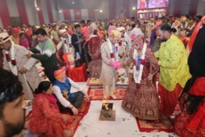 संस्थान संस्थापक पद्मश्री अंलकृत कैलाश ‘मानव’ सह संस्थापिका कमला देवी, अध्यक्ष प्रशांत अग्रवाल, निदेशक वंदना अग्रवाल व पलक अग्रवाल द्वारा गणपति पूजन के पश्चात प्रातः 11 बजे शुभ मुहूर्त में दूल्हों ने क्रमवार परम्परागत तोरण की रस्म का निर्वाह किया। इसके बाद भव्य पाण्डाल में गाते-झूमते अतिथियों के बीच जोड़ों ने संस्थान अध्यक्ष प्रशान्त अग्रवाल व निदेशक वंदना अग्रवाल के सहयोग से स्टेज पर वरमाला डाली। इस दौरान उन पर पुष्प वर्षा की झड़ी लग गई। विवाह स्थल पर आतिशबाजी हुई। इसके बाद मुख्य आचार्य