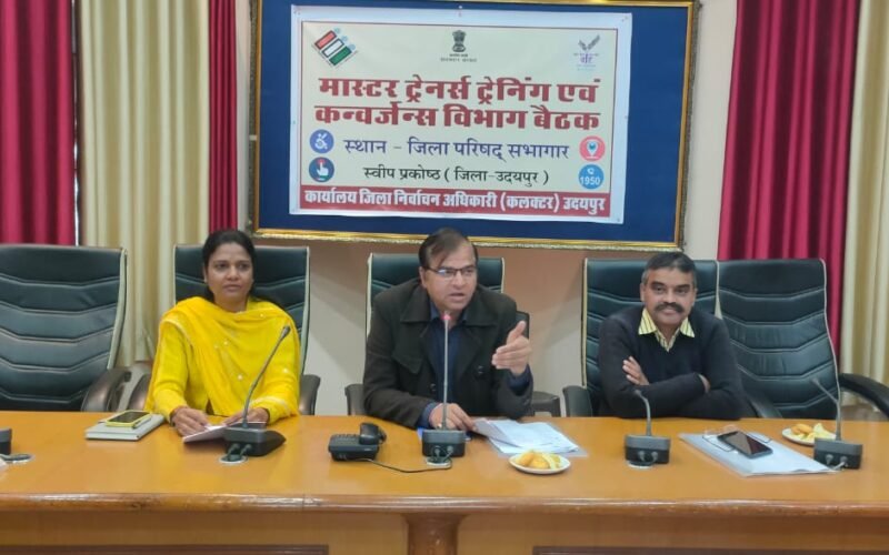 उदयपुर, 14 फरवरी। आगामी लोकसभा आम चुनाव-2024 में अधिक से अधिक मतदान सुनिश्चित करने के लिए निर्वाचन आयोग के निर्देशानुसार गठित स्वीप प्रकोष्ठ के तत्वावधान में मास्टर ट्रेनर्स का प्रशिक्षण और कन्वर्जेंस विभागों की बैठक बुधवार को जिला परिषद सभागार में आयोजित हुई।