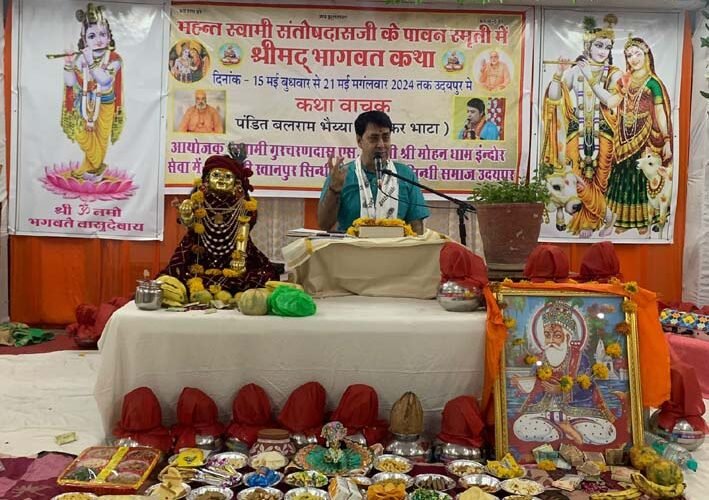 उदयपुर। सिन्धु भवन स्थित भूपालपुरा में मोहनधाम आश्रम इंदौर के संत स्वामी गुरुचरण उदासी द्वारा सत्संग किया गया जिसमें श्री कृष्णा भगवान का जन्मदिन मनाया गया । पूज्य श्री खानपुर सिन्धी पँचायत के अध्यक्ष किशन वाधवानी के बताया की सिन्धी भाषा मे श्री मद् भागवत कथा के पाँचवे दिन सेकड़ो की सख्या में श्रद्धालुओं ने सत्संग में भाग लिया। पंचायत के राजेश खत्री ने बताया कि सिन्धी श्री मद् भागवत कथा रोज़ाना शाम 5:00 बजे से 8:00 बजे व 15 मई से 20 मई तक होगी ,21 मई मंगलवार को महाप्रसादी होगी।