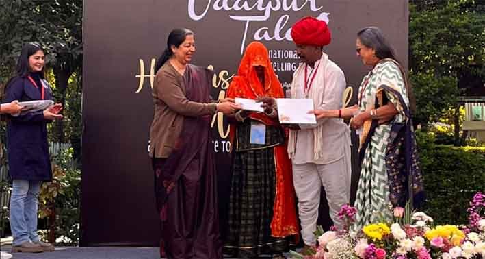 उदयपुर। बड़ी-शिल्पग्राम स्थित पार्क एक्सजोटिका रिर्सोट में चल रहे अंतर्राष्ट्रीय कहानी महोत्सव उदयपुर टेल्स के दूसरे दिन आज पहली बार कहानी कहने की तीन प्रतिभाओं को महोत्सव में सम्मानित किया गया।