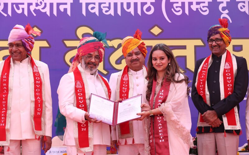 उदयपुर 13 नवंबर। राजस्थान विद्यापीठ विश्वविद्यालय का 21वां दीक्षांत समारोह गुरूवार को प्रतापनगर स्थित महाराणा प्रताप खेल मेदान पर आयोजित किया गया। समारोह का शुभारंभ मुख्यएनसीटीई नई दिल्ली के अध्यक्ष प्रो. पंकज अरोड़ा, कुलपति प्रो. शिवसिंह सारंगदेवोत, विशिष्ठ अतिथि भक्त कवि नरसिंह मेहता विवि जुनागढ़ गुजरात के कुलपति प्रो. प्रतापसिंह चौहान, राज्यपाल सलाहकार ( उच्च शिक्षा ) प्रो. कैलाश सोडाणी, समारोह अध्यक्ष, कुल प्रमुख एवं कुलाधिपति भंवर लाल गुर्जर, रजिस्ट्रार डॉ. तरूण श्रीमाली, परीक्षा नियंत्रक डॉ. पारस जैन ने पांच पंडितों के वैदिक मंत्रोच्चारण के साथ मॉ सरस्वती की प्रतिमा पर पुष्पांजलि एवं दीप प्रज्जवलित कर किया।
