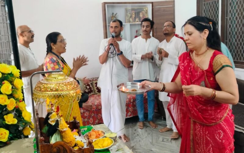 कृष्ण भजनों और स्तुतियों वेद मन्त्रों की अनुगुंज की स्वर लहरियों के बीच-कृष्ण भजनों और स्तुतियों वेद मन्त्रों की अनुगुंज की स्वर लहरियों के बीच ठोलक,मजीरो, हरताल की ध्वनि के बीच में नाचते गाते झूमते साधकों की टोली शहर के बाहुबली कॉलोनी स्थित भगवान कृष्ण बलराम, गोरनताई प्रभुजी की पालकी में मनमोहक दृश्य के साथ सनातनी हिन्दू अगवानी कर रहे हैं ।