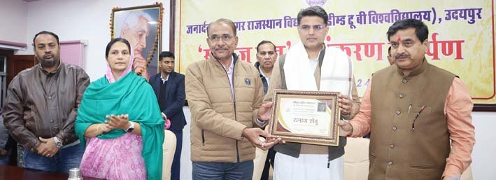 उदयपुर 19 जनवरी / जर्नादन राय नागर राजस्थान विद्यापीठ डीम्ड टू बी विश्वविद्याय की ओर से शुक्रवार को कांग्रेस के वरिष्ठ नेता एवं राज्य के पूर्वउपमुख्यमंत्री सचिन पायलट को उनके द्वारा किए गए सामाजिक उत्थान की उत्कृष्ट सेवाओं एवं मानवीय मूल्यों के लिए उनके अवदान हेतू ‘‘समाज सेतु‘‘ अलंकरण से नवाजा गया। जिसके तहत उन्हे अलंकरण प्रशस्तिका, स्मृति चिन्ह ,शॉल भेंट की गई। इससे पूर्व ये सम्मान स्वर्गीय राजेश पायलट को भी प्रदान किया गया। इस अवसर पर पायलट ने कहा कि हमारा विकास केवल हमारे अकेले के प्रयासों की परिणीति नहीं है ये हमारे साझे और स्वार्थरहित उन कार्यों का लेखा जोखा है जो सामाजिक प्रगति रूप में परिलक्षित होता है। पायलट ने कहा कि हम सभी को प्रेम और सौहार्द की मिसाल बन कर समाज को एकजुट रखना होगा। प्यार और मोहब्बत बाटते हुए आपसी दूरी और खाईयों को पाटने का काम करना होगा। उन्होंने युवा पीढ़ी का आव्हान किया कि भाईचारे को जीवन का मंत्र बना कर सफलता कि नई इबारत गढ़नी होगी।
