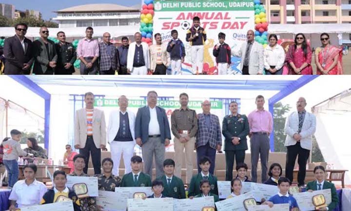 उदयपुर। दिल्ली पब्लिक स्कूल, उदयपुर में शैक्षणिक सत्र 2025-26 के अंतर्गत 19 दिसंबर 2025 को भव्य वार्षिक खेल दिवस का आयोजन विद्यालय प्रांगण में किया गया। कार्यक्रम का शुभारंभ मुख्य अतिथि श्री के.के.गुप्ता (समन्वयक स्वच्छ भारत मिशन ग्रामीण राजस्थान सरकार), विशिष्ट अतिथि नीरज बत्रा (कोच इंडियन लैक्रोस टीम), कर्नल जितेंद्र कुमार, गोपाल स्वरूप मेवाड़ा, चिन्मय चैधरी एवं सुदीक्षा सिंह देवड़ा के आगमन से हुआ, जिन्हें अश्व दस्ता द्वारा सम्मानपूर्वक मंच तक लाया गया। तत्पश्चात अतिथियों एवं गणमान्यजनों को पुष्पगुच्छ भेंट कर स्वागत किया गया।