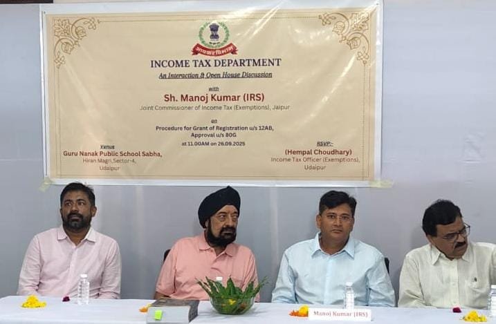 उदयपुर। आयकर विभाग ने आज गुरु नानक पब्लिक स्कूल सभागार में आयकर अधिनियम की धारा 12एबी और धारा 80जी के तहत के पंजीकरण और अनुमोदन की प्रक्रिया पर एक आउटरीच कार्यक्रम सफलतापूर्वक आयोजित किया। जिसमें चार्टर्ड अकाउंटेंट, कर पेशेवर, धर्मार्थ संगठनों के ट्रस्टी और शैक्षणिक संस्थानों के प्रतिनिधियों सहित 100 से अधिक हितधारकों ने भाग लिया।