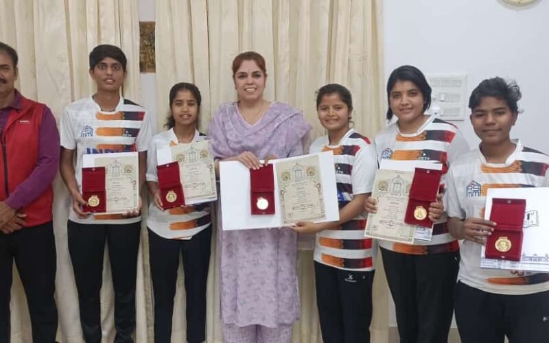 उदयपुर, 03 मार्च। सिटी पैलेस में आयोजित 41 वें महाराणा मेवाड फाउंडेशन प्रतिभा सम्मान समारोह के महाराणा राज सिंह अवॉर्ड से सम्मानित होने पर ओलम्पिक खेल लेक्रोज की एशियाई रजत पदक विजेता भारतीय टीम का सम्भागीय आयुक्त प्रज्ञा केवलरमानी ने अभिनंदन किया। रजत पदक विजेता टीम की कप्तान सुनीता मीणा, मीरा कुमारी दोजा, जुला कुमारी गुर्जर, विशाखा मेघवाल व हेमलता डांगी का संभागीय आयुक्त प्रज्ञा केवलरमानी ने अपने कार्यलय में अभिनंदन कर उज्जवल भविष्य की शुभकामनाएं दी। इस अवसर पर अतिरिक्त संभागीय आयुक्त छोगाराम देवासी, टीएडी उपायुक्त गीतेश श्री मालवीय, अधिकारी गण, प्रशिक्षक नीरज बत्रा, राष्ट्रीय पदक विजेता खिलाड़ी, खेलप्रेमी आदि उपस्थित थे।