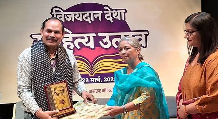 उदयपुर, 26 मार्च। राजस्थान सरकार की बजट घोषणा के अनुसार जयपुर के जवाहर कला केन्द्र द्वारा ग्रासरूट मीडिया फाउंडेशन के क्यूरेशन में तीन दिवसीय ‘ विजयदान देथा साहित्य उत्सव’ का भव्य आयोजन हुआ। उत्सव का उद्घाटन कला और संस्कृति विभाग के शासन सचिव रवि जैन, जेकेके की अतिरिक्त महानिदेशक अलका मीणा तथा ग्रासरूट मीडिया के प्रमोद शर्मा ने किया । राज्य स्तरीय इस साहित्य महोत्सव में विजयदान देथा के साहित्यिक योगदान पर राज्य के प्रतिष्ठित साहित्यकारों की चर्चा के साथ विभिन्न सांस्कृतिक सत्रों की रचना की गई। बजट घोषणा अनुसार पहली बार हुए इस आयोजन में मेवाड़ के साहित्यकार के रूप में चर्चित कवि तथा चित्रकार चेतन औदिच्य एवं  सुखाडिया विश्वविद्यालय के राजस्थानी भाषा विभाग के अध्यक्ष डॉ सुरेश कुमार सालवी ने प्रतिनिधित्व किया।