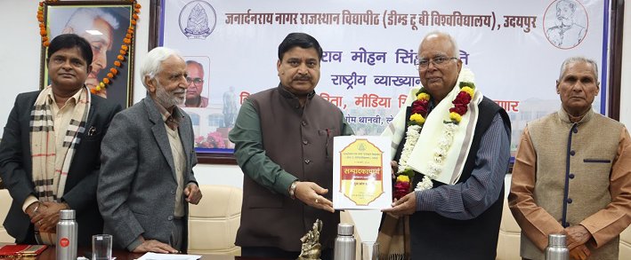 उदयपुर 17 फरवरी। सूचना और जानकारी देने से कही अधिक आवश्यक समाज में समाज को साझा करते हुए विवेक जागृत करना मीडिया अथवा समाचार पत्रों का कार्य है जिससे समाज के जानने के बुनियादी अधिकार को बनाए रखा जा सके। समय और परिस्थितियों के मद्देनजर संचार के माध्यमों और उनकी प्रासंगिकता में भी बदलाव आए है, लेकिन इनके प्रभावों से कोई भी कालखण्ड अछूता नहीं रहा है। समाज से जुड़े मुद्दे और मसलों के कारणों और समाधानों पर कार्य करने, चेतना पैदा करने का दायित्व मीडिया पर रहा है। मीडिया को एक तरह से समाज का दर्पण कहा जा सकता है। देश की मीडिया ने स्वतंत्र अभिव्यक्ति से लेकर इंमरजेंसी तक के समय को देखा है और राष्ट्र को दिशा देने का कार्य किया है। उक्त विचार शनिवार को जनार्दनराय नागर राजस्थान विद्यापीठ डीम्ड टू बी विवि की ओर से स्थापित कविराव मोहनसिंह पीठ की ओर से पत्रकारिता, मीडिया शिक्षण और रोजगार विषय पर आयोजित राष्ट्रीय व्याख्यान में प्रख्यात लेखक और संपादक ओम थावनी ने बतौर मुख्य वक्ता कही।