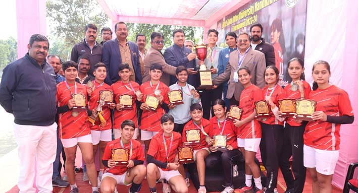 उदयपुर 23 जनवरी / सुखाड़िया विश्वविद्यालय की मेजबानी में आयोजित वेस्ट जॉन इंटर यूनिवर्सिटी महिला हैंडबॉल प्रतियोगिता में तीसरे क्वालिफाई मैंच में जनार्दनराय नागर राजस्थान डीम्ड टू बी विश्वविद्यालय की टीम ने महाराजा गंगा सिंह विवि बीकानेर को 15 गोल से हरा गोल्ड मेडल अपने नाम किया। सभी खिलाड़ियों को मुख्य अतिथि सुखाड़िया विवि की कुलपति प्रो. सुनीता मिश्रा, विद्यापीठ कुलपति प्रो. शिवसिंह सारंगदेवोत, उपमहापौर पारस सिंघवी, अंतराराष्ट्रीय हैंडबॉल कोच मनीषा राठौड़, अध्यक्ष डॉ. नीरज शर्मा, आयोजन सचिव डॉ. भीमराज पटेल, डॉ. भवानीपाल सिंह राठौड़, डॉ. दिलीप सिंह चौहान ने स्वर्ण पदक, ट्राफी एवं स्मृति चिन्ह देकर सम्मानित किया। प्रो. सारंगदेवोत ने टीम को बधाई देते हुए कहा कि टीम वर्क से ही हर मैंच को जीता जा सकता है, चाहे वह खेल मैदान पर हो या अन्य कोई हो। फरवरी के तीसरे सप्ताह में विद्यापीठ की मेजबानी में ऑल इंडिया महिला हैण्डबॉल प्रतियोगिता का आयोजन किया जायेगा जिसमें ये सभी खिलाड़ी ऑल इंडिया मेडल के लिए अपना दमखम दिखायेंगे। इससे पूर्व पिछले वर्ष विद्यापीठ की मेजबानी में आयोजित वेस्ट जॉन इंटर यूनिवर्सिटी महिला हॉकी प्रतियोगिता में भी विद्यापीठ टीम गोल्ड मेडल हासिल कर चुकी है।