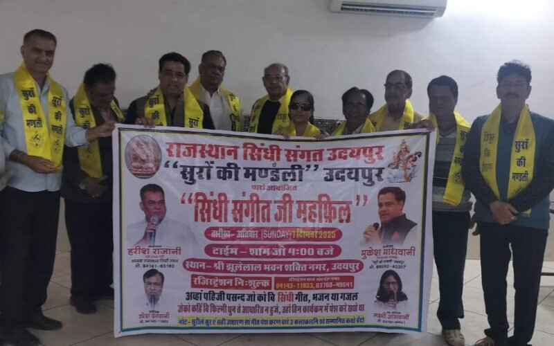 उदयपुर: श्री झूलेलाल भवन शक्ति नगर, उदयपुर में रविवार 7 दिसम्बर 2025 को आयोजित होने वाली “सिन्धी सँगीत की महफ़िल” के पोस्टर का विमोचन पूर्व राज्य मंत्री व राजस्थान सिन्धी संगत तथा पूज्य जैकबआबाद सिन्धी पंचायत, उदयपुर के अध्यक्ष हरीश राजानी तथा सुरों की मण्डली के संस्थापक अध्यक्ष मुकेश माधवानी द्वारा किया गया।