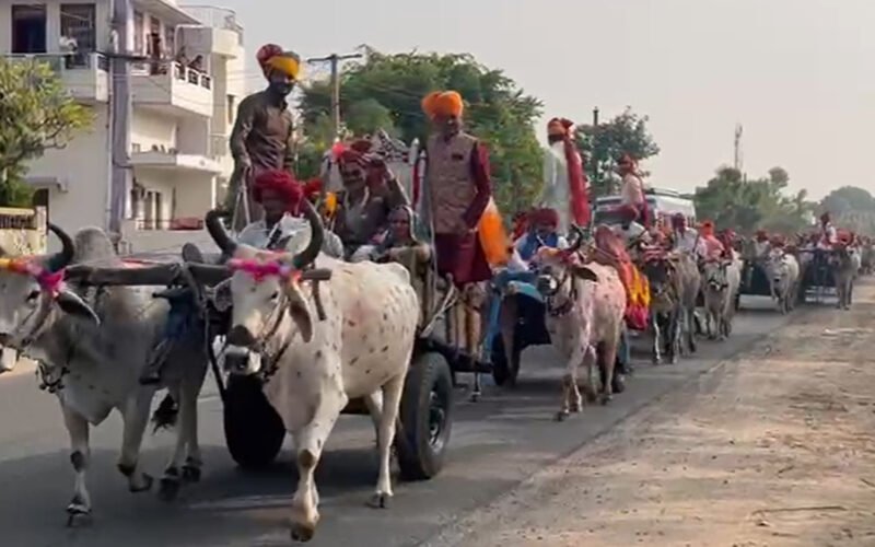 इस ऐतिहासिक बारात की सबसे बड़ी खासियत रही 21 बैलगाड़ियों की आकर्षक झांकी, जिन्हें राजस्थानी पारंपरिक शैली में विशेष रूप से सजाया गया था। बारातियों ने रंग-बिरंगी राजस्थानी वेशभूषा, साफे-पगड़ियां और पारंपरिक श्रृंगार के साथ पूरे रास्ते माहौल को उत्सवमय कर दिया।