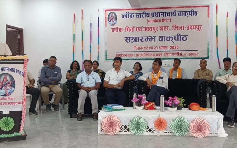 उदयपुर, 22 अगस्त। गिर्वा ब्लॉक एवं उदयपुर शहर के प्रधानाचार्यों की दो दिवसीय सत्रारंभ वाकपीठ (माध्यमिक शिक्षा) 2025 का उद्घाटन दिनांक 22 अगस्त को सरस्वती शिक्षक सदन, टेगौर नगर, सेक्टर 4 के सभागार में किया गया। आयोजन के मुख्य अतिथि विधायक महोदय उदयपुर शहर तारा चंद जैन थे। वाकपीठ की अध्यक्षता मुख्य ब्लॉक शिक्षा अधिकारी गिरवा दुर्गेश मेनारिया ने की।विशिष्ट आतिथ्य अतिरिक्त ब्लॉक शिक्षा अधिकारी ललित दक का प्राप्त हुआ।